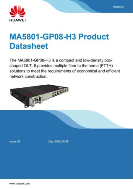 The MA5801-GP08-H3 is a compact and low-density box shaped OLT. It provides multiple fiber-to-the-home (FTTH) solutions to meet the requirements of economical and efficient network construction.