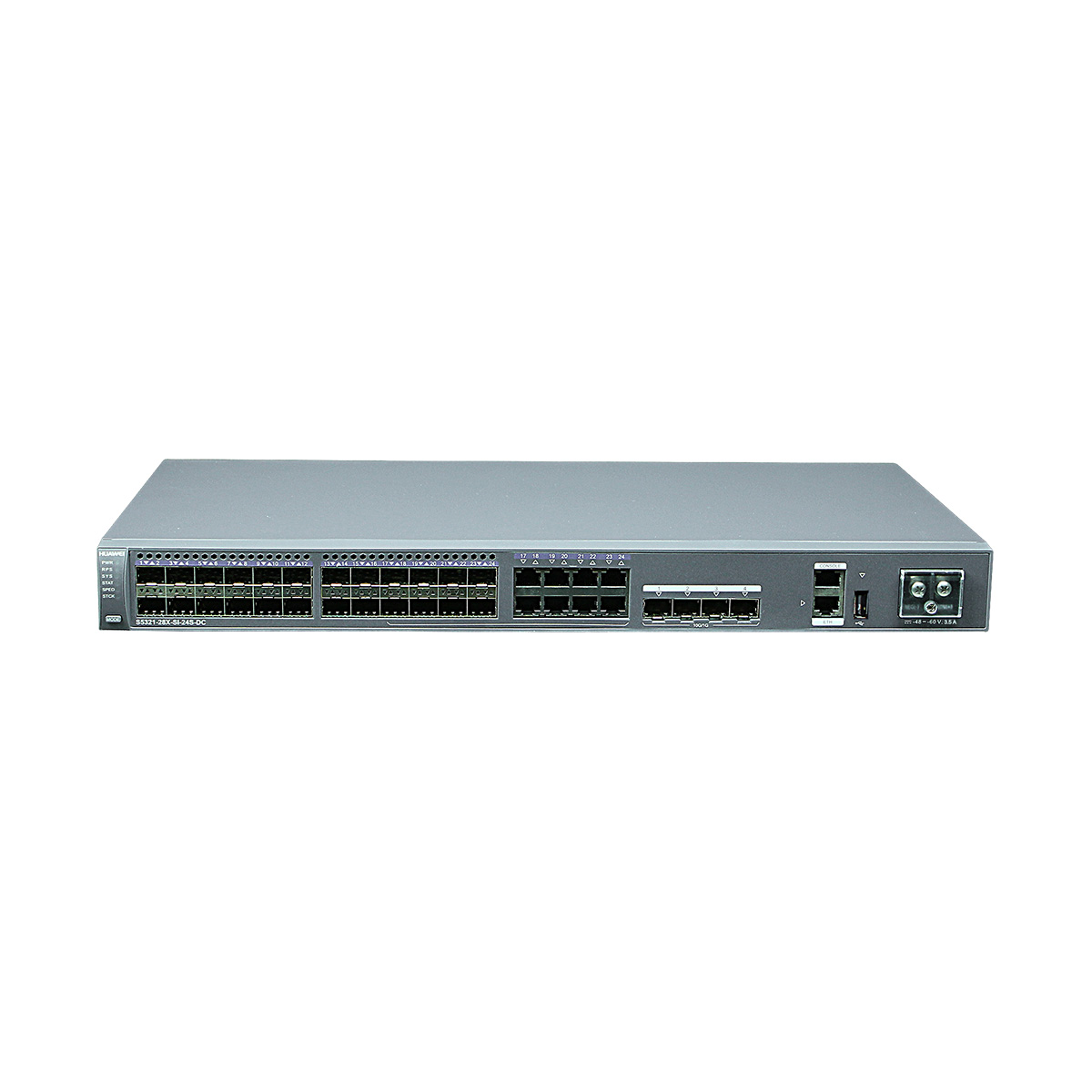 Huawei S5321-28X-SI-24S-DC switch supports 24 GE SFP ports, 8 of which are dual-purpose 10/100/1000BASE-T ports, 4 10GE SFP+ ports, fixed DC power