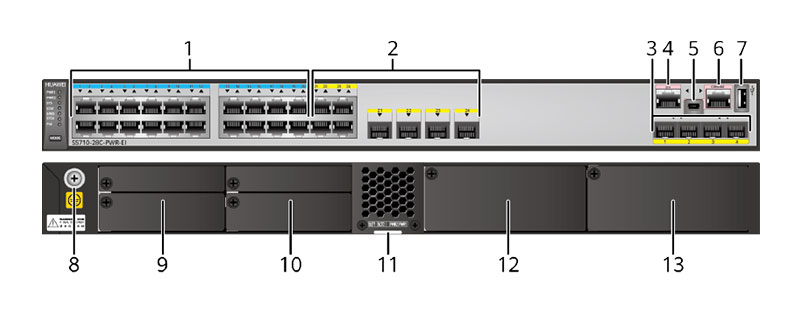 | 2 | Four 10GE SFP+ ports, 4 GE SFP combo ports | 8 | Ground screw |