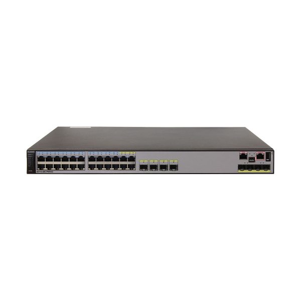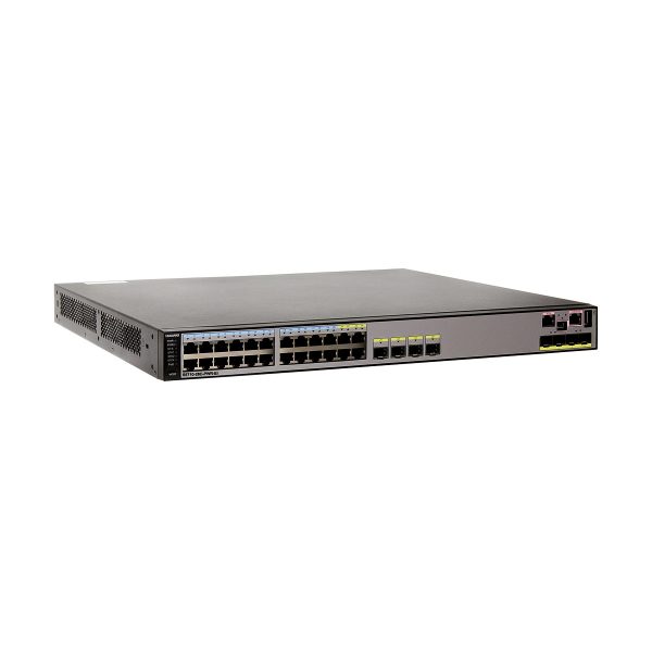 Huawei S5710-28C-PWR-EI-AC switch supports 20 1000BASE-T PoE+ ports, 4 GE SFP combo ports, 4 10GE SFP+ ports, 2 power slots, 2 extension slots, wihtout power module
