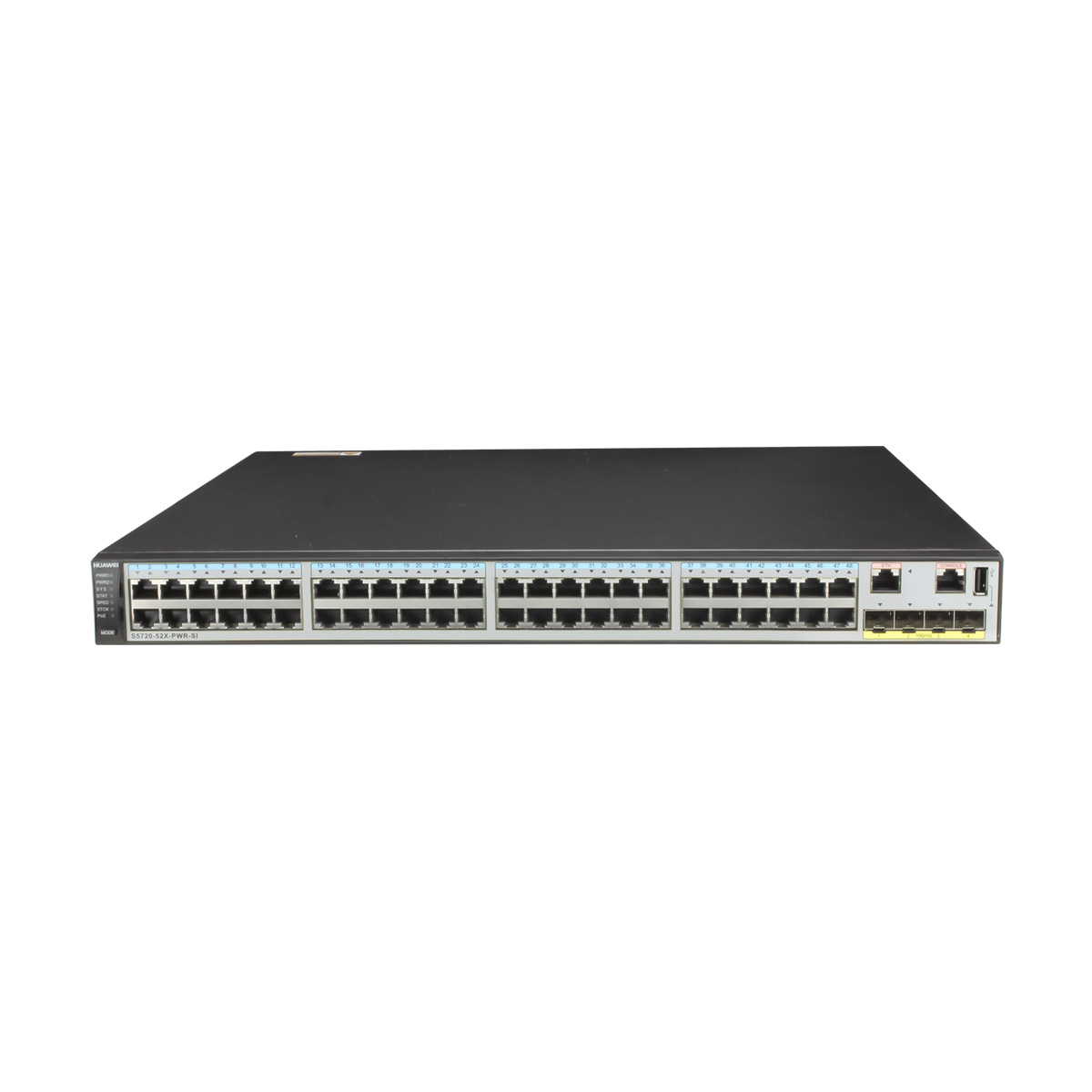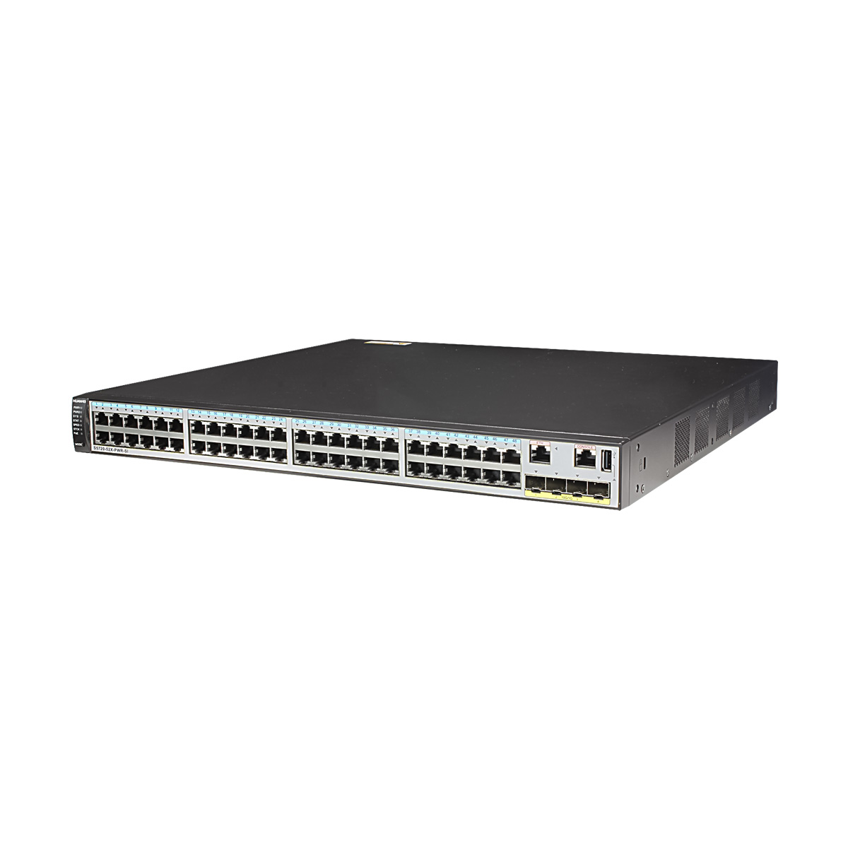 Huawei S5720-52X-PWR-SI-ACF switch with 48 10/100/1000BASE-T ports, 4 10GE SFP+ ports, 2 hot swappable AC power supplies, 1 AC equipped, PoE+, which is one of the S5720 serie switch.