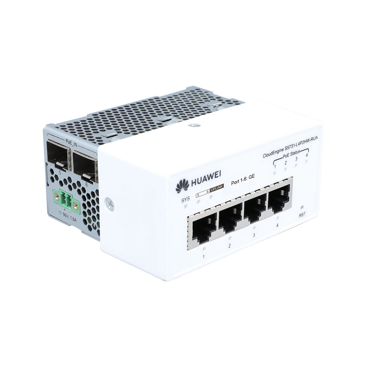Huawei S5731-L4P2HW-RUA switch supports 4*10/100/1000BASE-T ports, PoE++, 2*GE hybrid optical-electrical SFP ports, AC power, power adapter