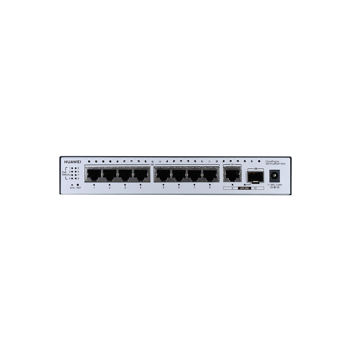 Huawei S5731-L8P2ST-RUA supports 8*10/100/1000BASE-T ports, PoE+, 1*GE SFP port, 1*10/100/1000BASE-T port, AC power, power adapter