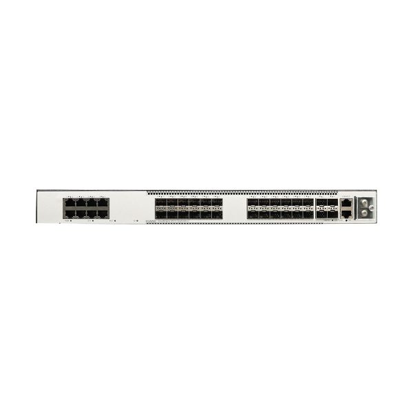 This Huawei switch comes with 8 10/100/1000BASE-T ports, 24 GE SFP ports, 4 10GE SFP+ ports, DC power, front access