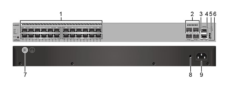 | 1 | Twenty-four 10/100/1000BASE-T ports | 2 | Four 10GE SFP+ ports |