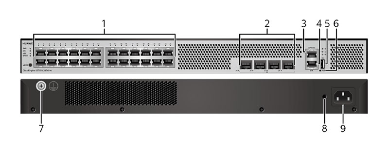 | 2 | Four 1000BASE-X ports | 7 | Ground screw |
