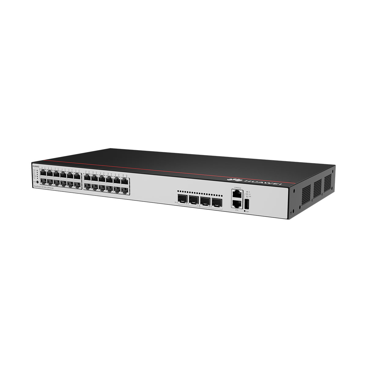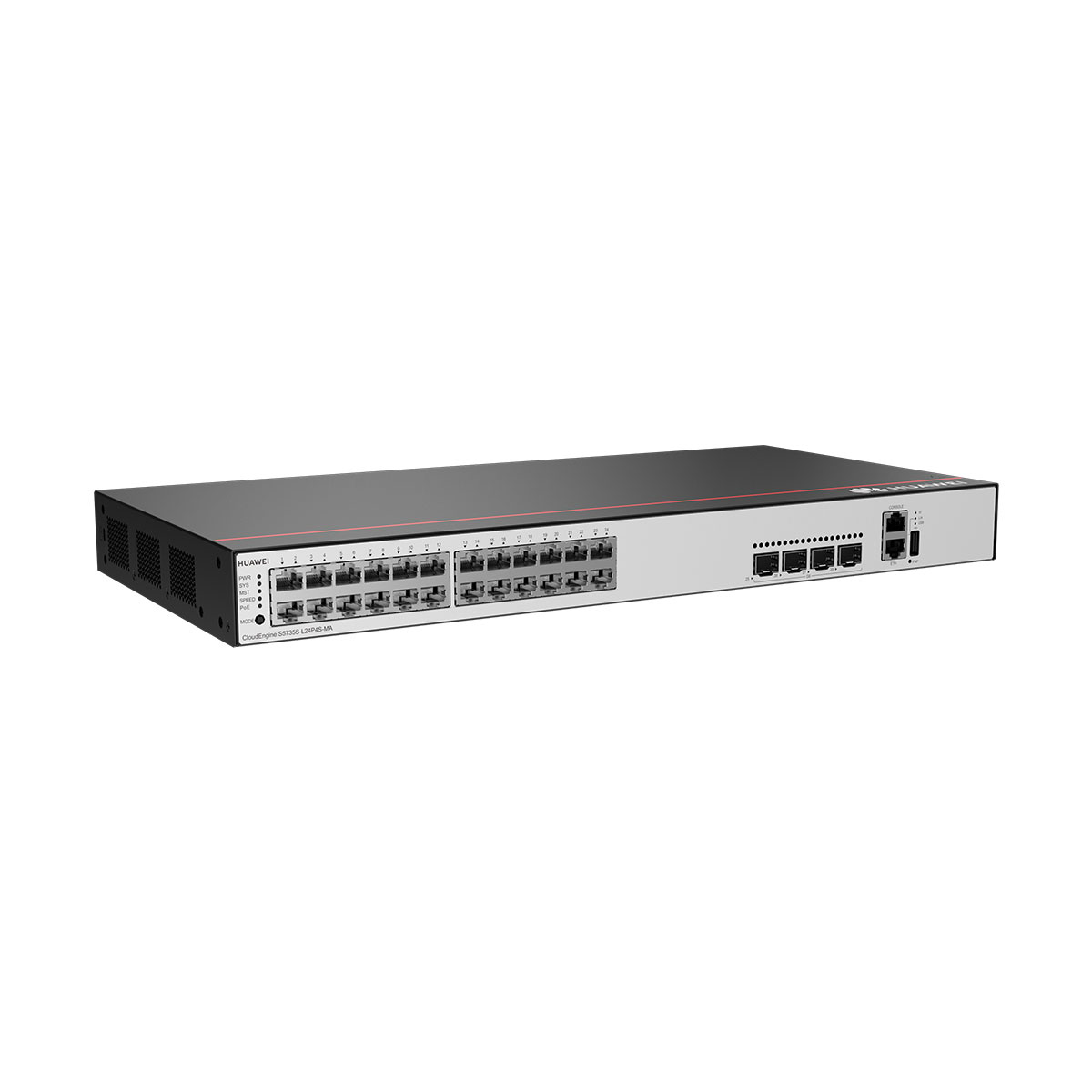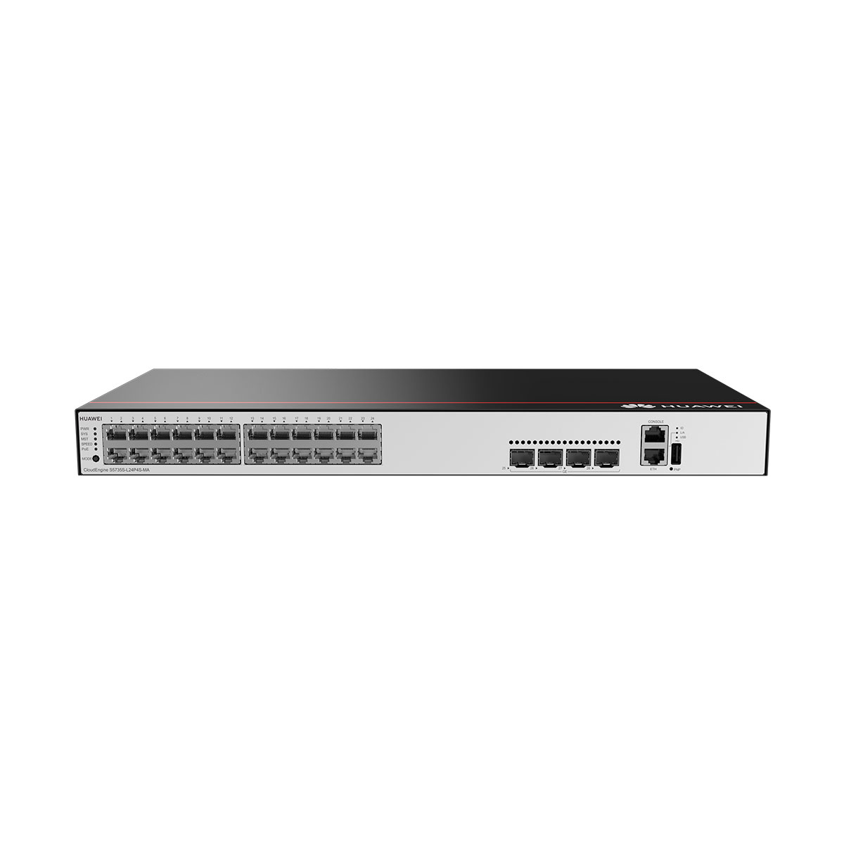 Huawei S5735S-L24P4S-MA switch supports 24* PoE+ 10/100/1000BASE-T ports, 4* GE SFP ports, 1* AC power fixed