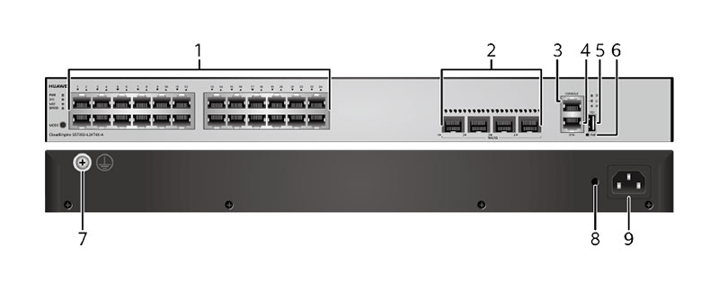 | 2 | Four 10GE SFP+ ports | 7 | Ground screw |