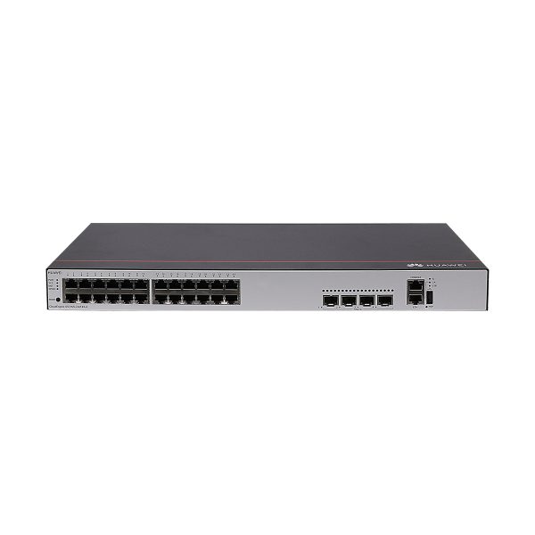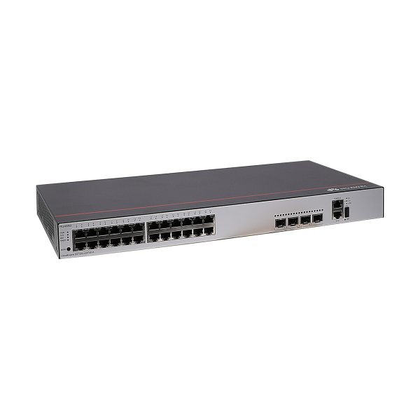 This Huawei switch comes with 24 1000BASE-T ports, 4 10GE SFP+ ports, 1 AC power fixed