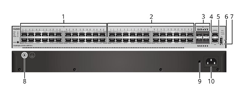 This Huawei switch supports 24 10/100BASE-TX ports, 24 10/100/1000BASE-T ports, 4 1000BASE-X ports, 1 AC power fixed