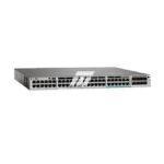 Cisco WS-C3850-48XS-F-S switch supports 48 SFP+ and 4 QSFP+ Ethernet ports, with 750WAC back-to-front power supply.